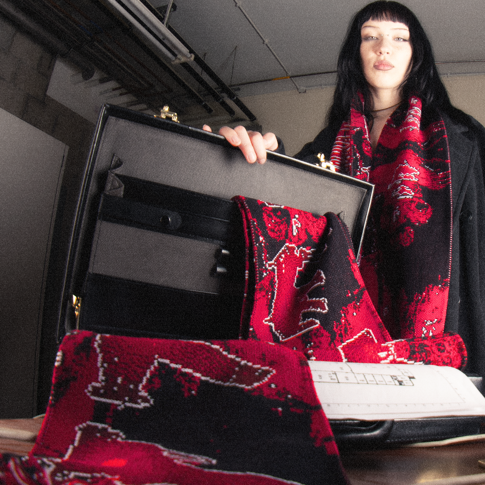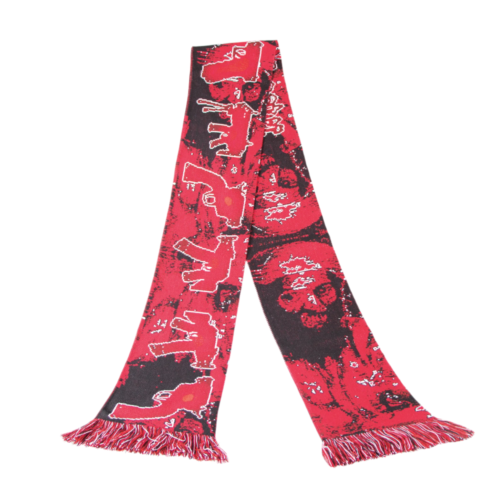 2-METER scarf with outlined cs:s styled gun motif's on the front and ''The Russian Sleep Experiment x Osama bin Laden" on the backside.